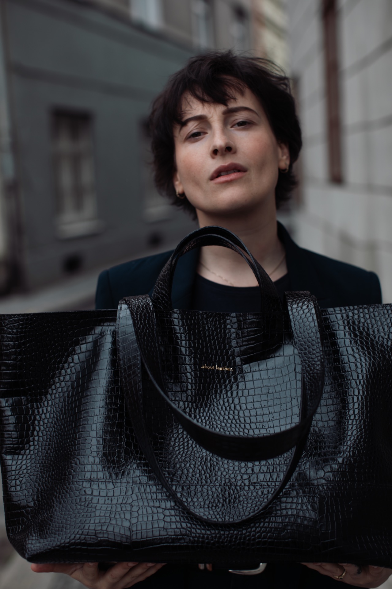 Nápad na vizuální estetiku editorialu nás přenáší zpět do nálady osmdesátých a devadesátých let, kombinující betonový urbanismus se selfie pózami a minimalistickými kabelkami .about leather.
