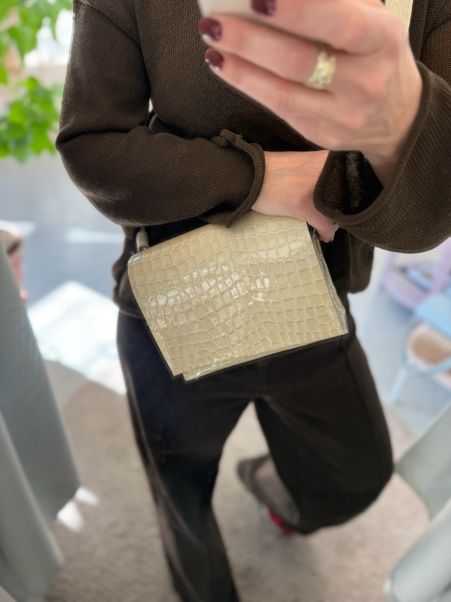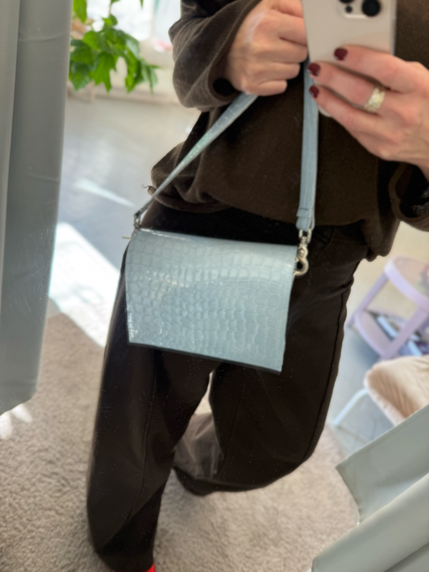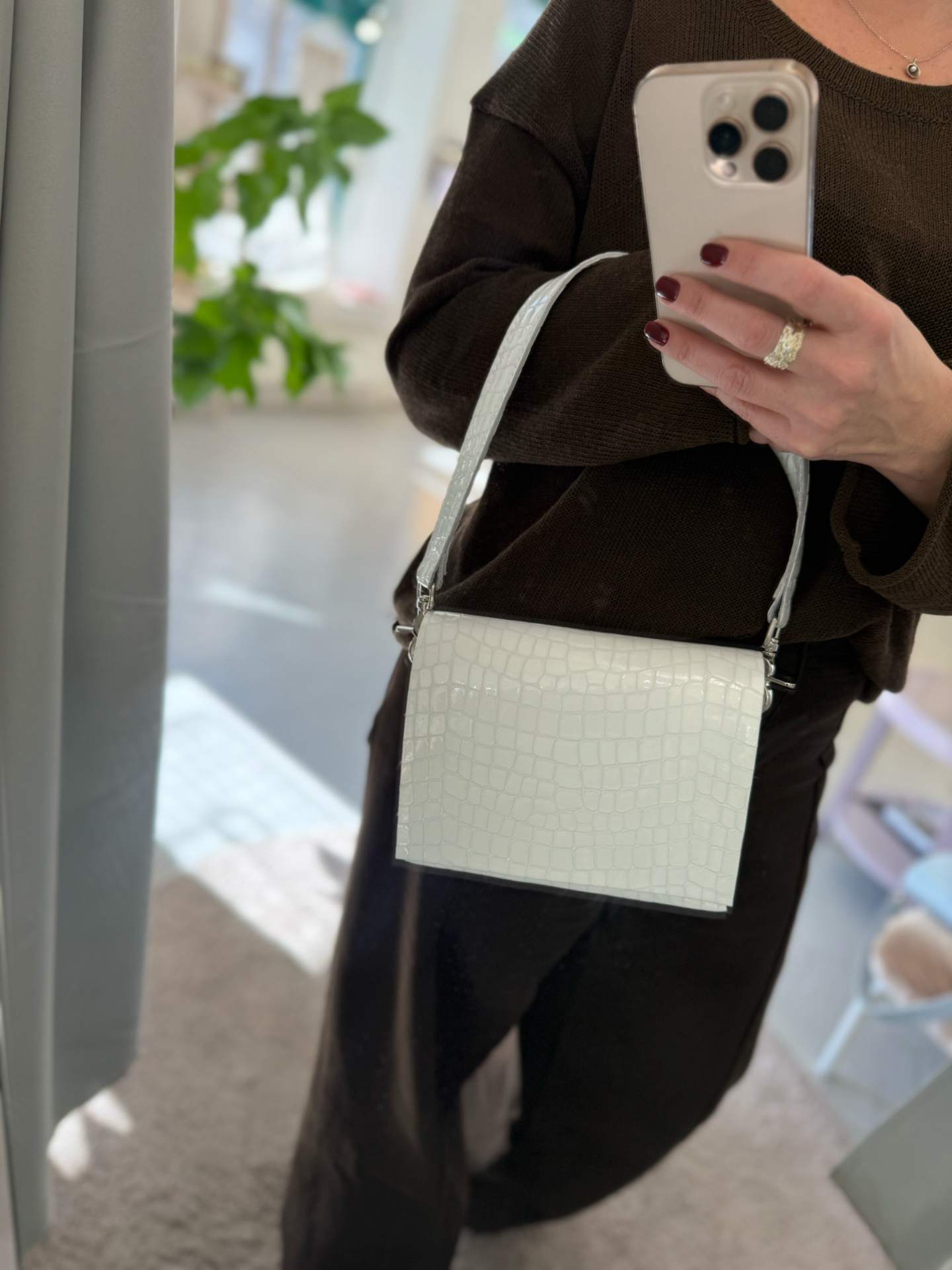 .polohovatelný odepínací pásek crossbody, druhý kratší přes rameno a do ruky, vnitřní kapsa na mobil, zapínání na magnet, logo slepotisk.